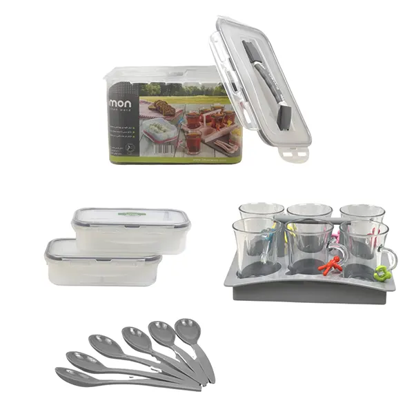 ست فره شامل : ۶ عدد لیوان ۶ عدد قاشق ۲ عدد ظرف ۲ خانه ۱ عدد باکس قفل دار ۱ عدد سینی به همراه ۶ عدد آدمک